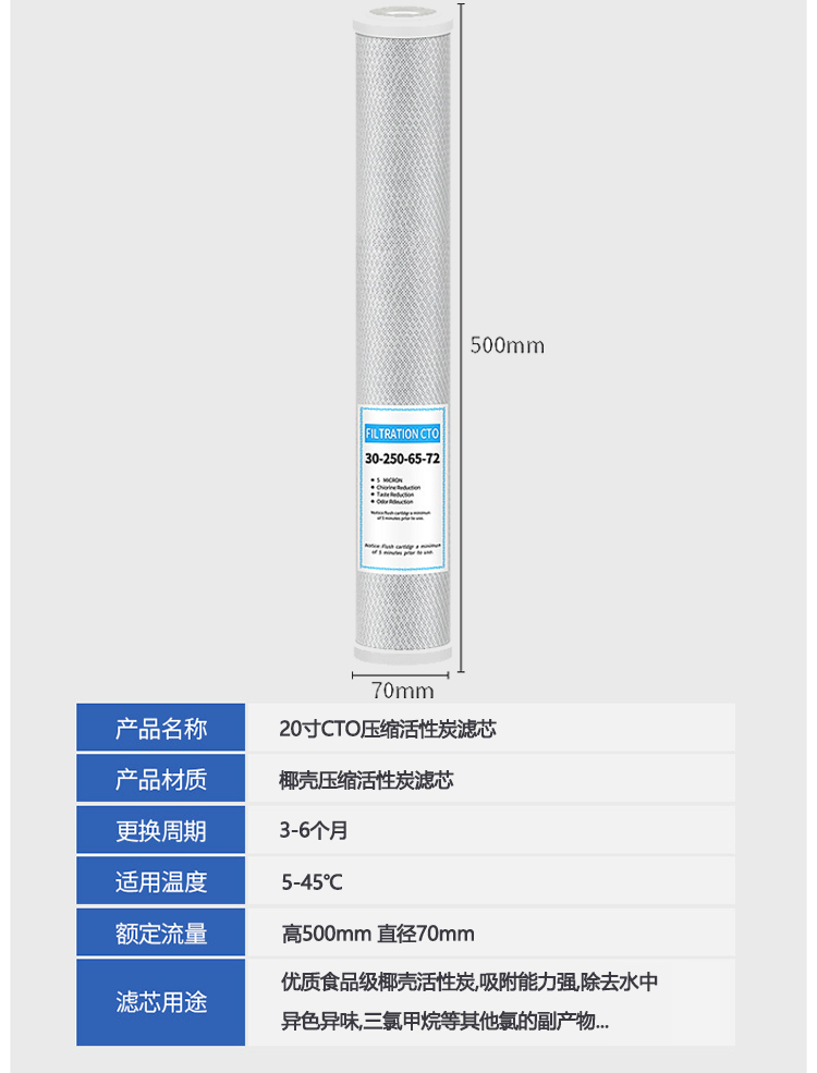 簡要描述:CTO壓縮活性炭濾芯:以好的果殼炭及煤質(zhì)活性炭為原料,采用高科技技術(shù),經(jīng)特殊工藝加工而成,活性炭濾芯內(nèi)外均分別包裹