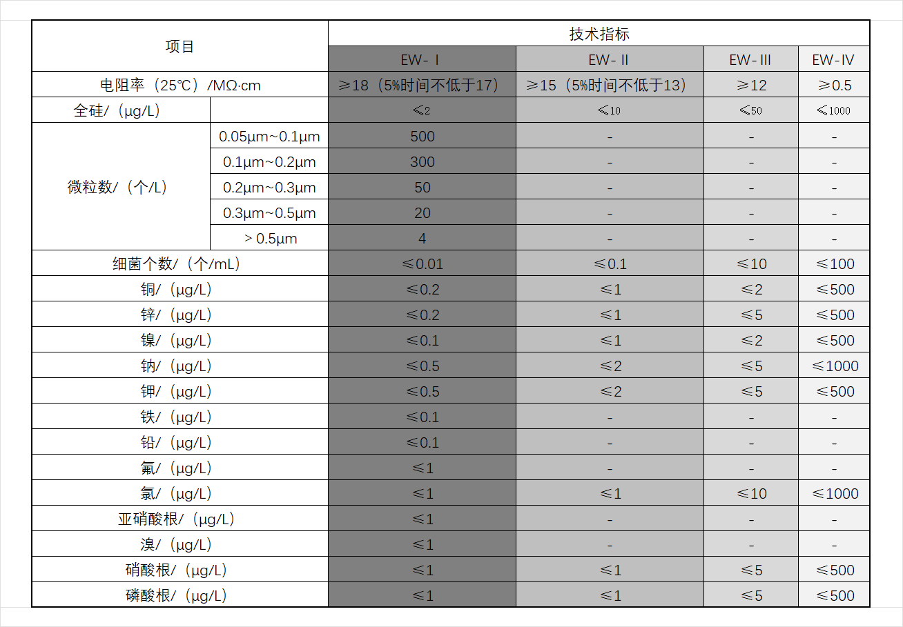 電子級水分為四個級別:Ⅰ級、Ⅱ級、Ⅲ級、Ⅳ級。